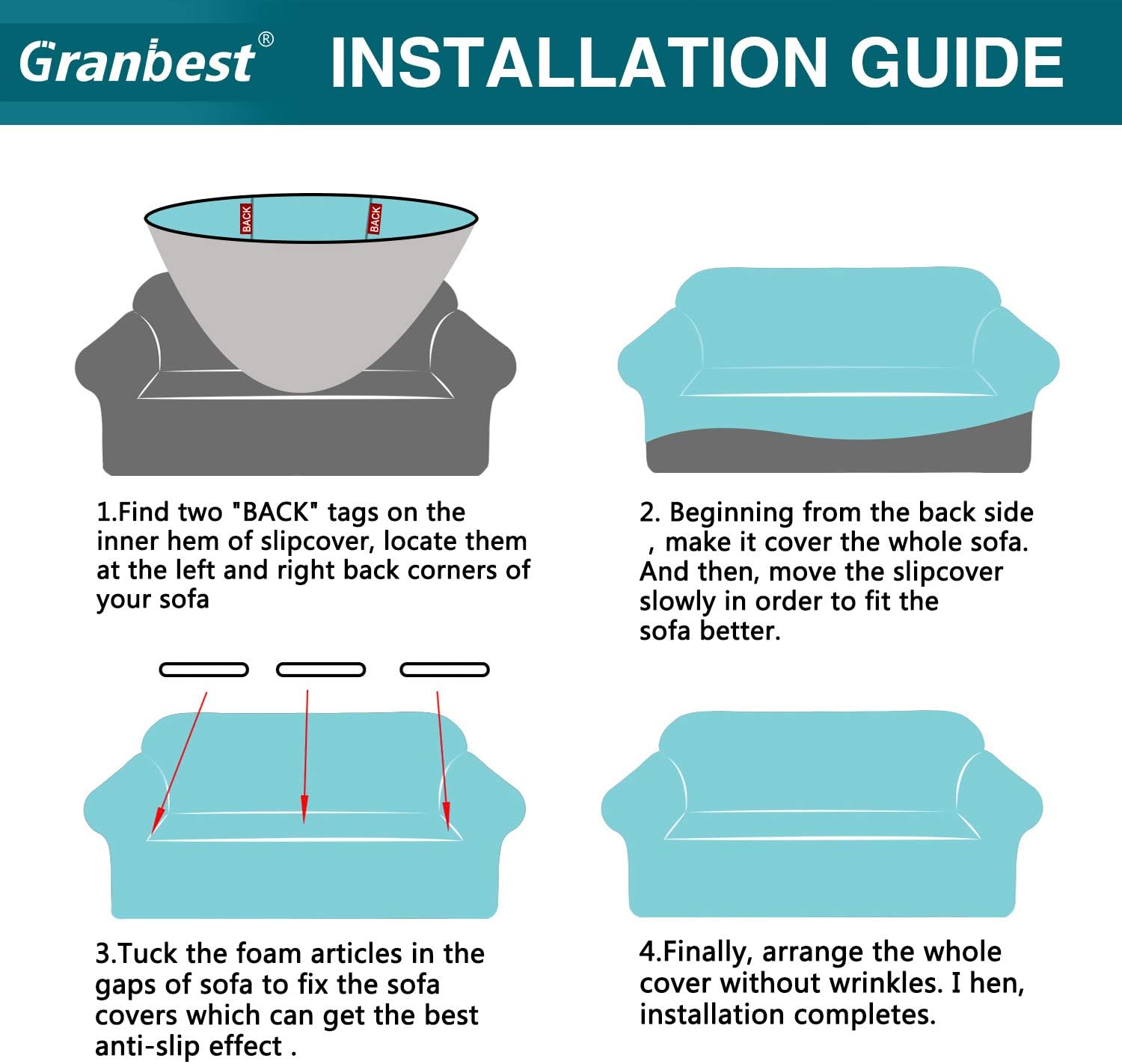 🌈EASY INSTALLATION&CARE: 1. There are two “BACK” labels on the inner hem of sofa protector cover. 2. Locate two “BACK” labels at the back corners of your sofa. Start from the back and cover the whole sofa. 3. Insert Styrofoams and tuck excess fabric between cushions and furniture frame until it is smooth. WASHING TIPS: Machine washable(cold), gentle cycle, tumble dry low