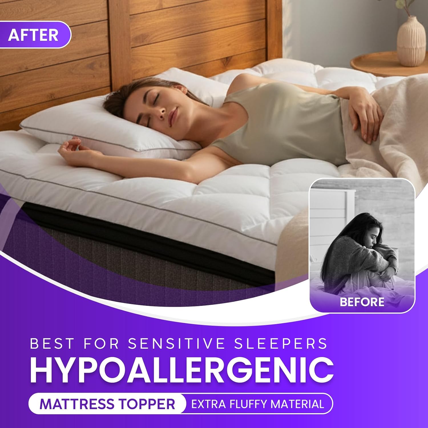 ๐๐๐๐๐๐๐: Made from breathable microfiber, the topper promotes airflow for cooler nights and reduced overheating. The hypoallergenic filling makes it suitable for sensitive sleepers, helping prevent irritation caused by dust and allergens. Free from strong chemical odors; any light packaging smell fades quickly after airing.