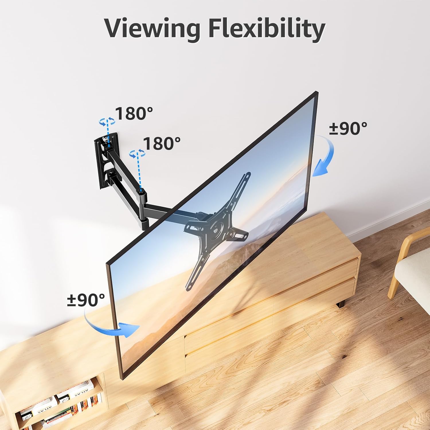 180° Rotation & Swivel Design: With the 180° rotation unique design, the full motion TV mount can easily display in landscape or portrait position to meet your special need. Also, this swivel TV mount can swivel TV 180° to cover any angles in your home for the ultimate viewing experience