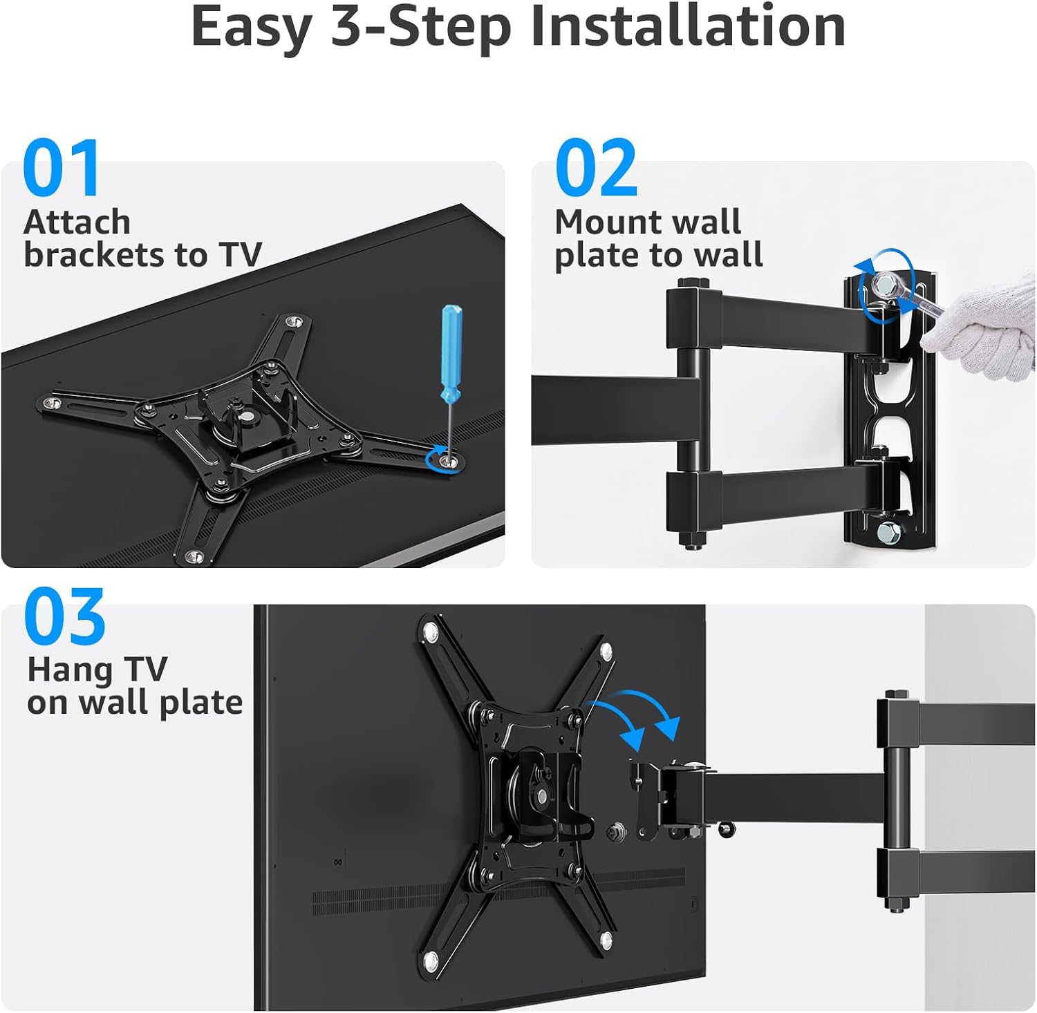 Easy Installation: The TV wall mount package comes with a completed hardware mounting kit, and the step-by-step instructions will guide you through the simple assembly and installation process. Note: Do Not install into drywall alone