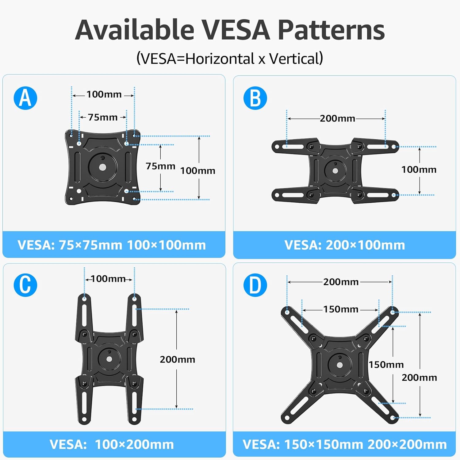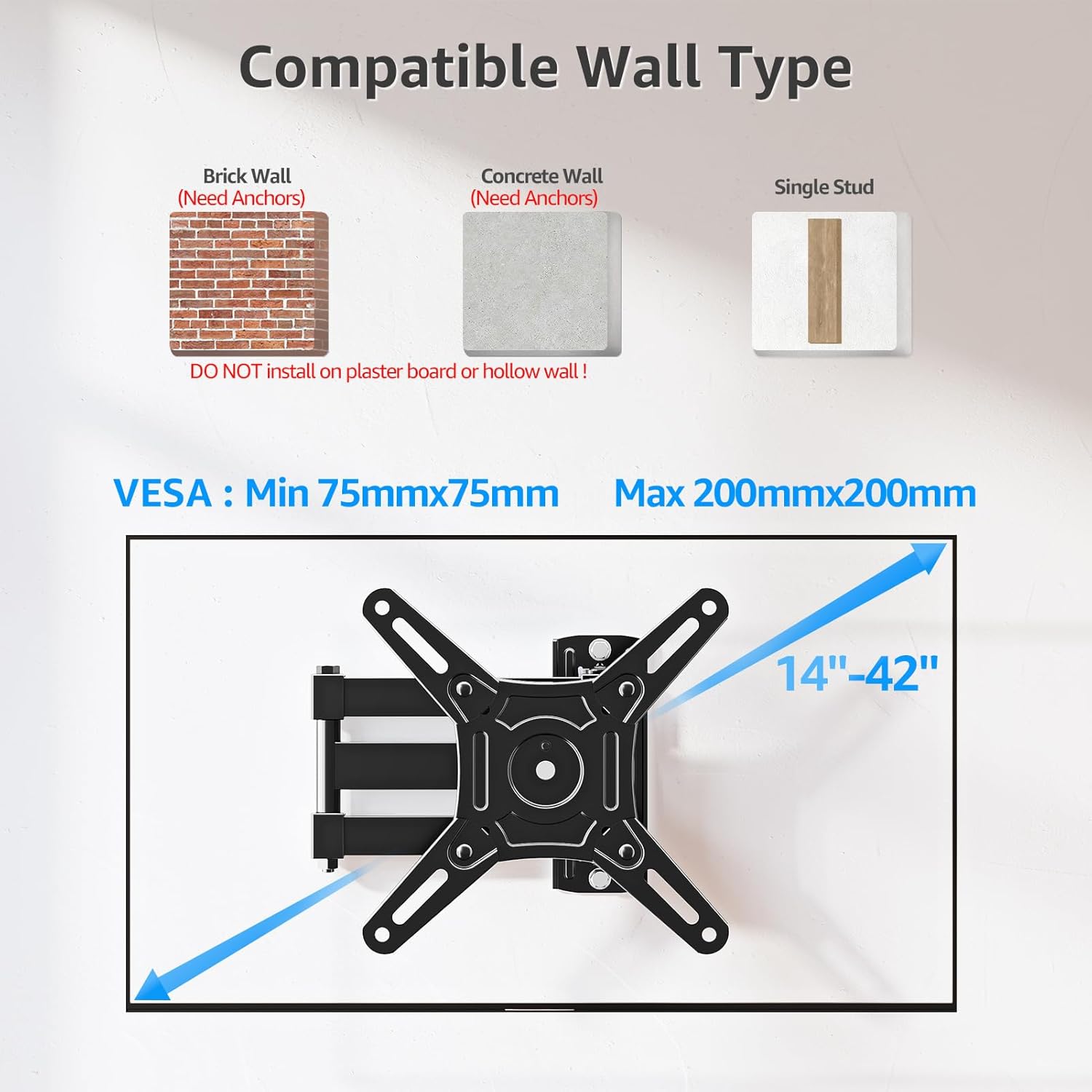 Universal Compatibility: This TV Wall Bracket fits for most 14 – 42 inch LED/LCD TVs and monitors, up to 15kg loading, compatible with VESA pattern from 75x75mm to 200x200mm. Please check the wall type, TV weight, VESA pattern, and reference TV size before purchasing this TV bracket