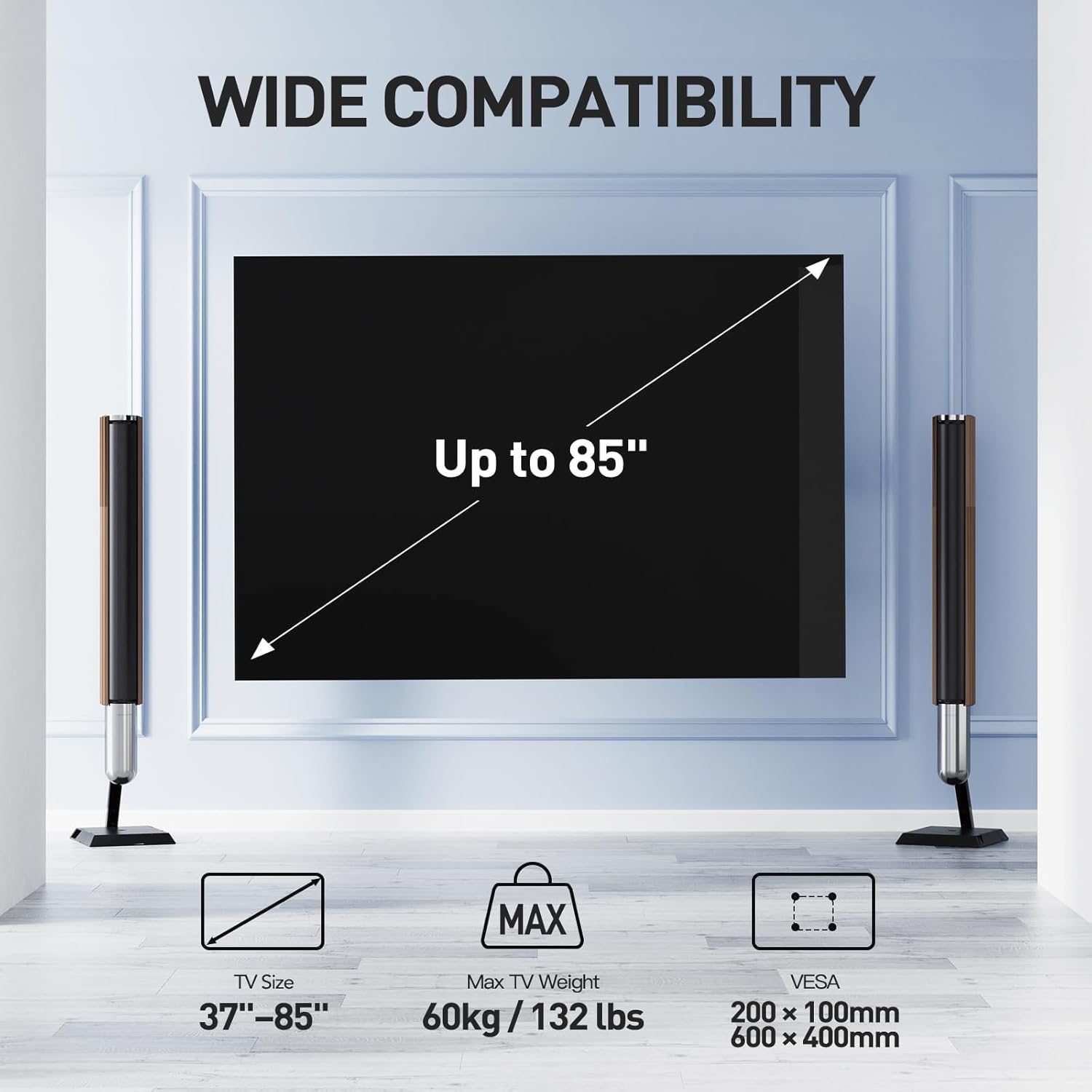 STRONG AND DURABLE TV WALL BRACKET – Experience strength with our TV wall bracket. Designed to accommodate most 37″-85″ (94-216 cm) TVs weighing up to 60 kg, this TV bracket ensures your television remains securely in place. It is compatible with VESA patterns 600×400, 600×200, 500×300, 400×400, 400×300, 400×200, 300×400, 300×300, 300×200, 200×400, 200×300, 200×200, and 200×100 mm. Please remember to verify your TV’s VESA pattern and weight before purchasing this TV wall mount