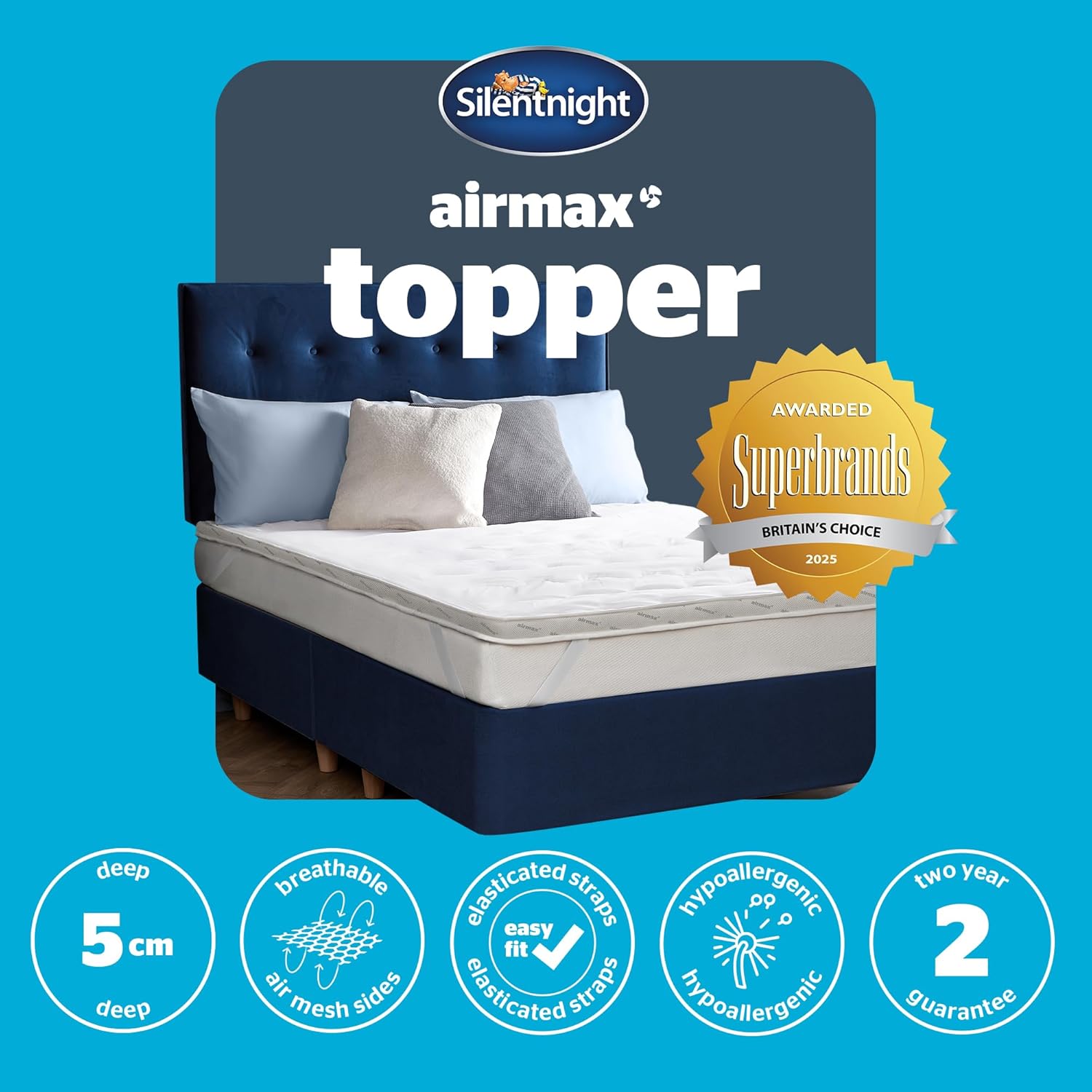The Silentnight Airmax Mattress Topper will transform your existing mattress, providing unparalleled breathability for a comfortably refreshing night’s sleep. Specially designed to increase airflow, the Airmax topper features dual construction which allows air to move freely in-between the layers. The air mesh sides help this air to move freely around your body to keep you comfortable in every season. Deeply filled with hollowfibre, the 8cm dual layer construction also provides ultimate comfort and will help to refresh and rejuvenate any mattress.